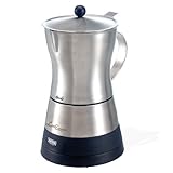 D2000.610 Features: -Hochwertige Ausführung.-Kompakte Bauart, aber mit unglaublichen 4-5 Bar Druck.-Ca. 2 Bar mehr Druck als herkömmliche Espressomaschinen dieser Bauart.-Mit zwei Ventilen zum Zubereiten von Milchkaffee, Espresso oder Mokka in nur wenigen Minuten.-Optimaler Druck- und Brühzyklus.-Autostopp-Funktion nach dem Brühen.-Füllt bis zu 1-3 Tassen Milchkaffee oder 3-6 Tassen Espresso.-Kabellos.-Funktionale 360° drehbare Heizstation mit integrierter Kabelaufwicklung.-Elektronisch geregelter Schalter mit integrierter Kontrollleuchte.-Versteckte Heizspirale unter dem Behälter.-Mit Überdruckventil.-Mit Überhitzungs- und Trockengehschutz.-TÜV-GS-geprüft.-Einfach zu Reinigen.-2 Jahre Herstellergarantie.-Material: Edelstahl.-Alle abnehmbaren Teile sind spülmaschinengeeignet.-Inhalt: 0,3 Liter.-Maße: 24,5cm H x 20cm B x 15,7cm T.-Gewicht: 1,7 Kg. Specifications: -Leistung: 400W.-Spannung: 230V ~ 50Hz.